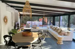 The house consists of: an entrance with storage, a spacious living room extended by a bright conservatory now combining the living and dining areas overlooking the pool.